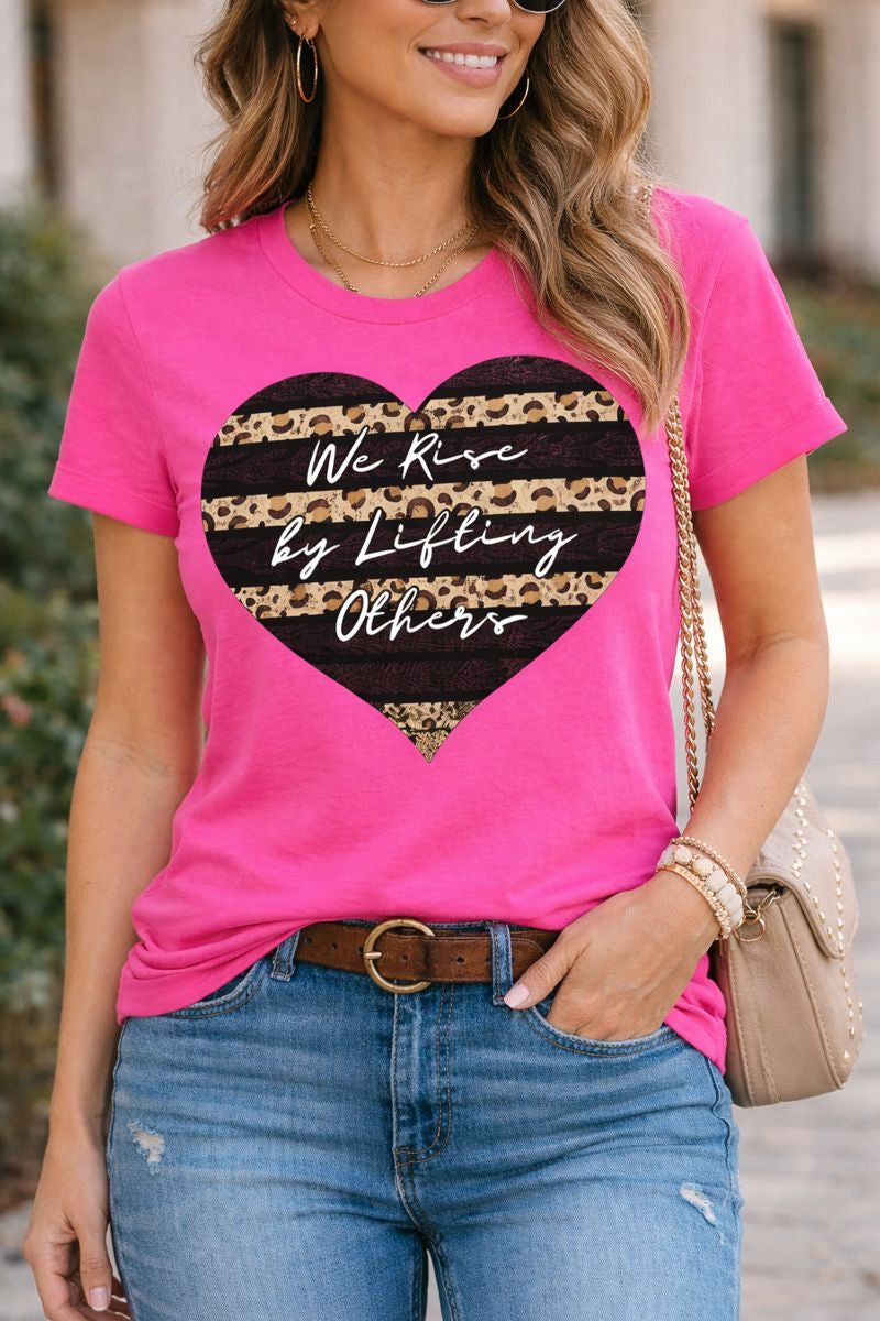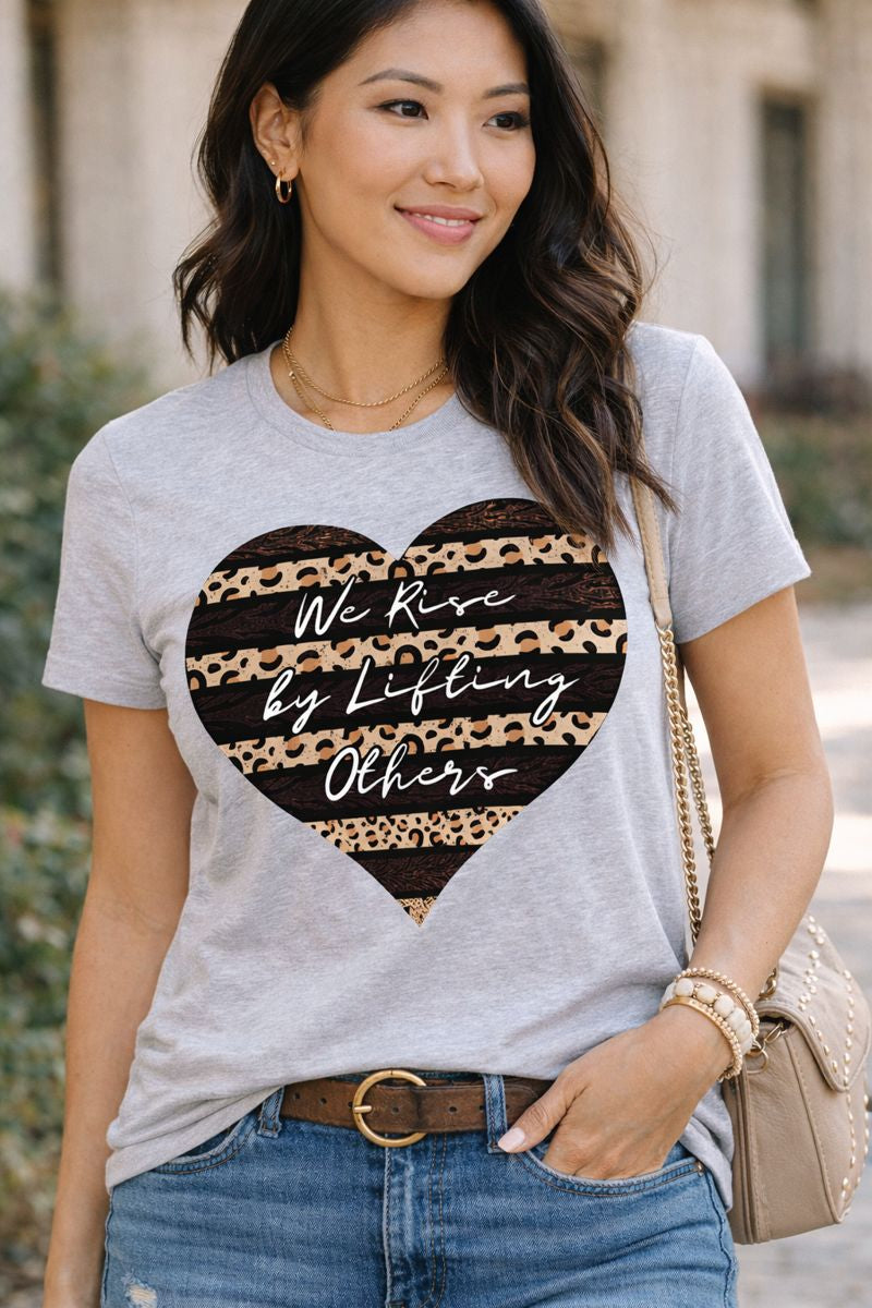 This uplifting design features the message “We Rise by Lifting Others” set against a bold heart graphic with a stylish animal-print accent. It’s a reminder that kindness, encouragement, and community make us stronger—perfect for everyday wear that spreads positivity without saying too much.